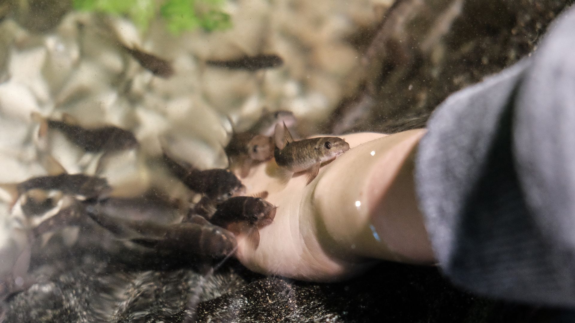 Dip your hands into a flowing freshwater habitat where curious doctor fish create a unique sensory experience.